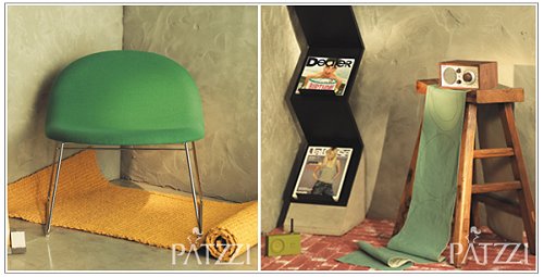 덴마크 콤폴트의 2003년 디자인인 그린 컬러의 라운드 구비 체어 1백64만원 인엔, 성긴 느낌의 옐로 라피아 러그 12만원 세컨드 호텔, 날렵한 라인의 전화기 베오컴 1401 27만원(테이블 홀더 포함) 뱅앤올룹슨