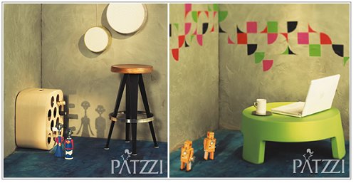 비비드한 컬러의 패턴 스티커 3만1천9백원 전망좋은 방, 장난감 책상을 연상시키는 키 낮은 탁자 17만7천원 한룩스, 특이한 라인의 스틸 받침이 돋보이는 컵 3만2천원 코발트, 태엽을 감으면 실제로 움직이는 로봇 5만원 세컨드 호텔