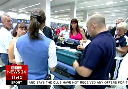 영국에서 비행기를 타려는 승객들에 대한 보안 검색은 엄청나게 강화되어 있다. 승객들은 보안 검색을 위해 길게 줄을 늘어서고 있다. 또한 휴대 가방이나 전자 제품 기내 반입은 일체 금지되어 버렸으며, 투명한 비닐 백에 지갑, 여권 등 필수품만을 겨우 넣어 휴대한 채 비행기에 탑승하는 실정이다.