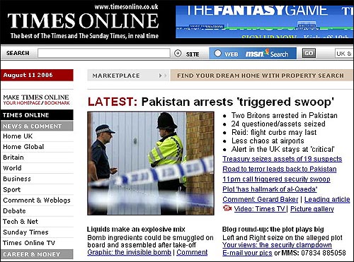 ▲ 파키스탄 정부의 협조로 엄청난 규모의 테러를 사전에 저지할 수 있었다는 내용의 영국 <더 타임즈> 인터넷판 기사. 극심한 혼란에 빠진 영국 공항들영국의 공항들은 긴급 체포 발표가 있었던 10일보다는 사정이 좀 나아졌지만, 아직은 극심한 혼란 상태에서 벗어나지 못하고 있다.