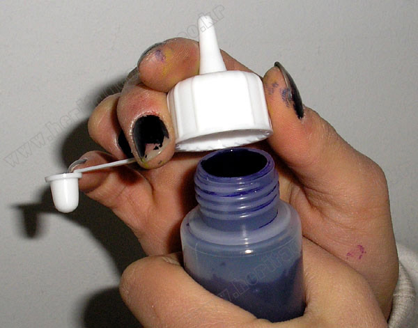 ▣노즐이 있는 작은 빈병에 큰통의 "섬유정용물감"을 따라 답는다.