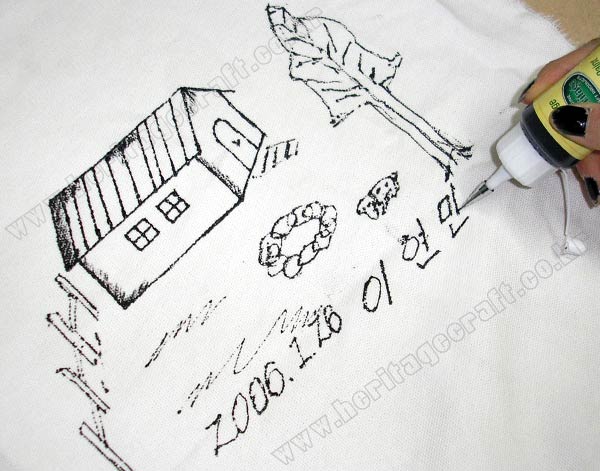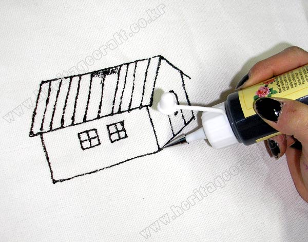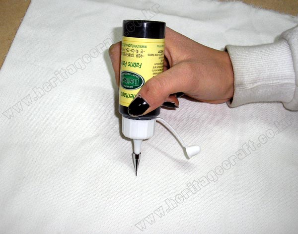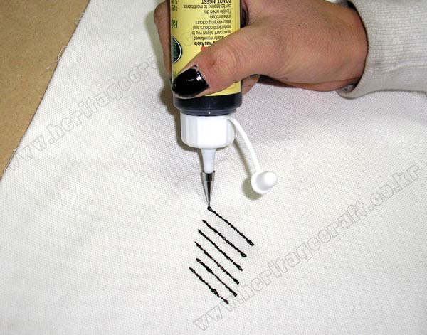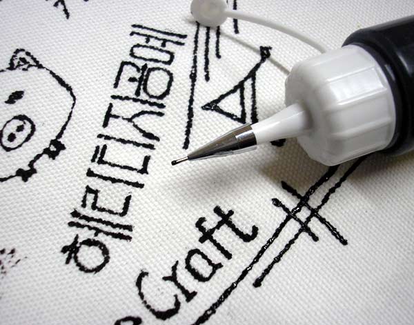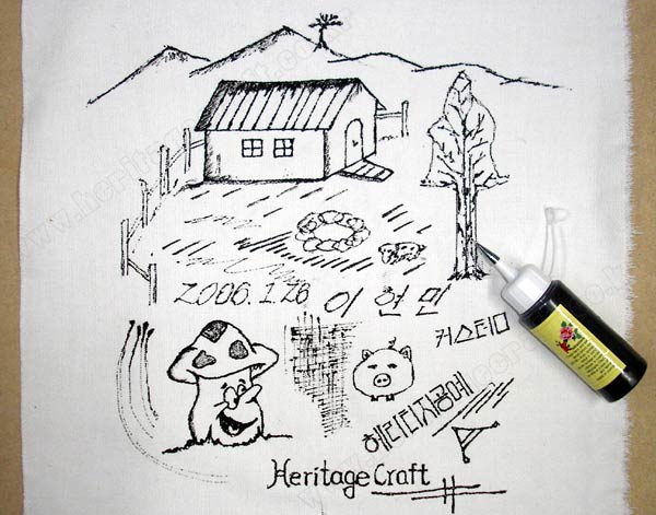 그림의 라인을 긋기 위해서는 피그펜을 사용하는 것이 좋다.다양한 색상의 "섬유전용 물감"을