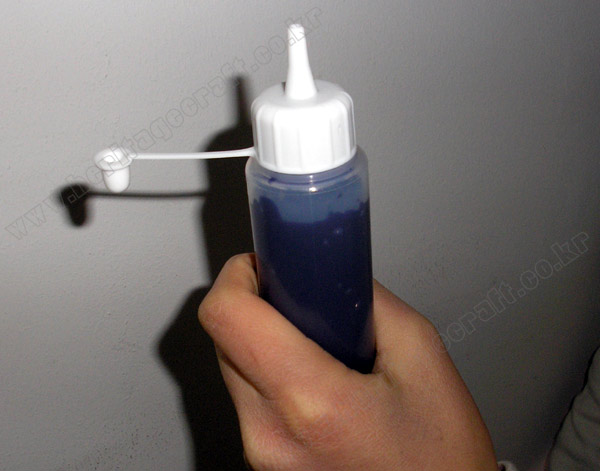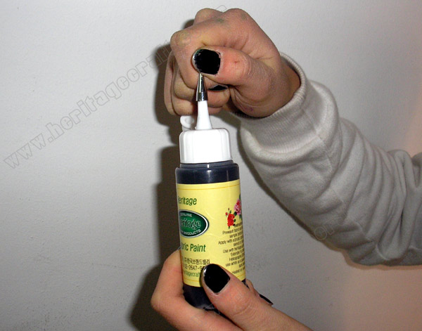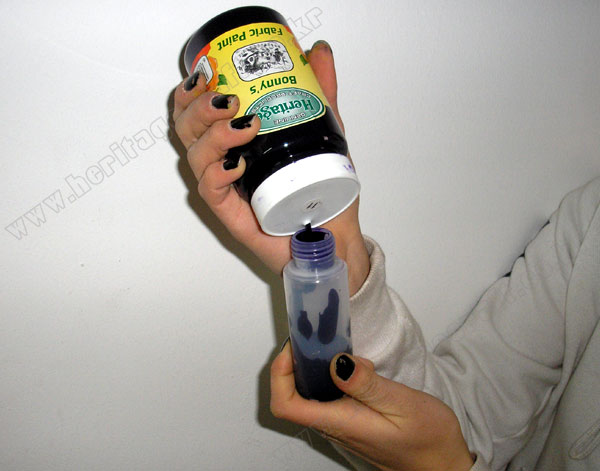 ▣작은 물감통에 "섬유전용물감"을 따라 넣고 노즐 모양의 병 뚜껑을 돌려 닫는다.