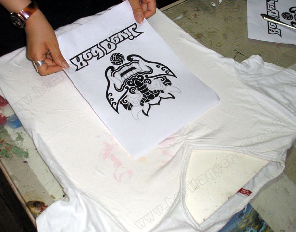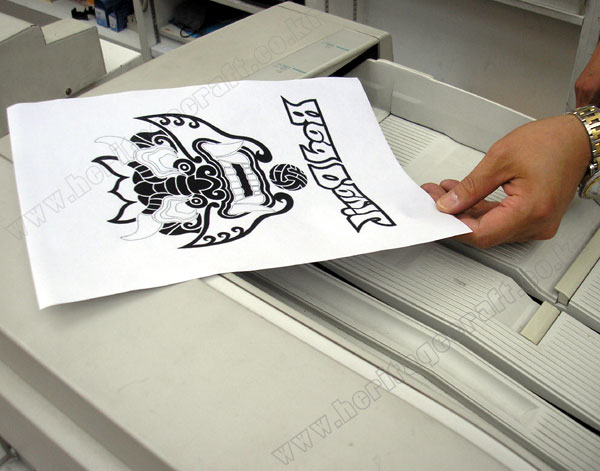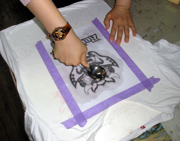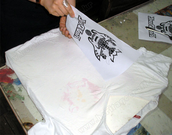 ▣토너를 사용한 레이져 프린터기와 복사기로 복사한 그림을 뒤집어 티셔츠에 고정하는 모습.
