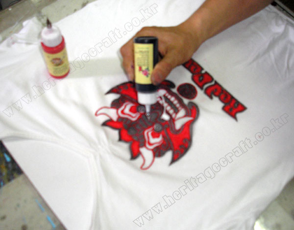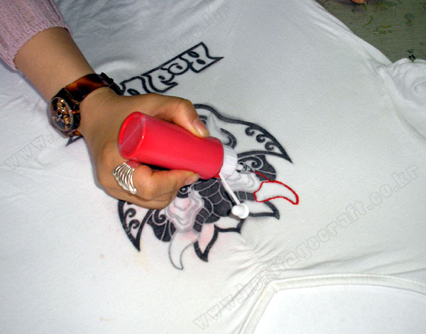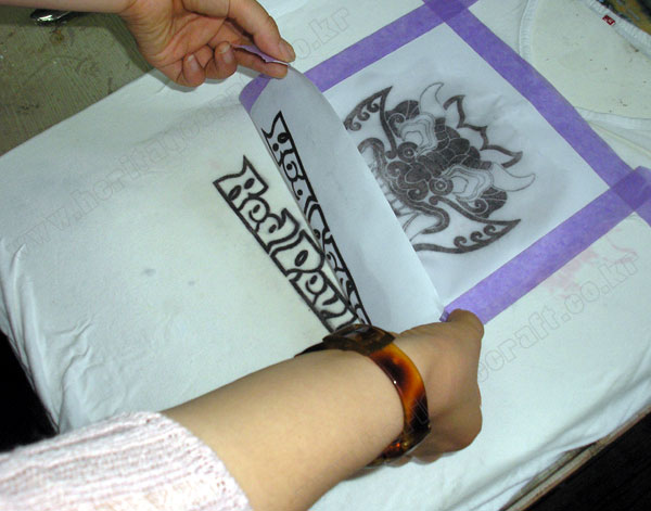 ▣그림의 외곽라인이 티셔츠에 잘 전사되었으면 붙인 그림을 띄어낸다.그림을 띄어낸 후 적어 있는