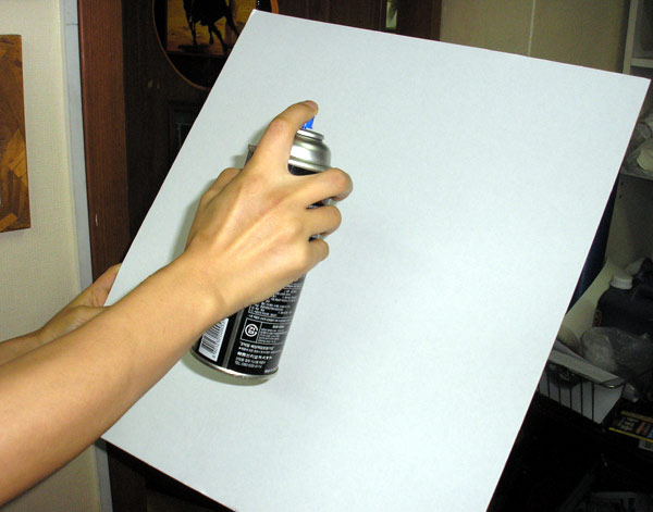 ▣자!슬슬 티셔츠에 그림을 그려보자.항상 그럿듯이 "하드보드지"에 "3M" 임시고정제를 뿌려 말린다.