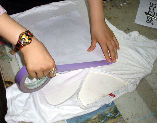 ▣티셔츠에 그림그릴 위치에 복사한 그림 또는 인쇄한 그림을 매스킹 테이프로 단단히 움직이지