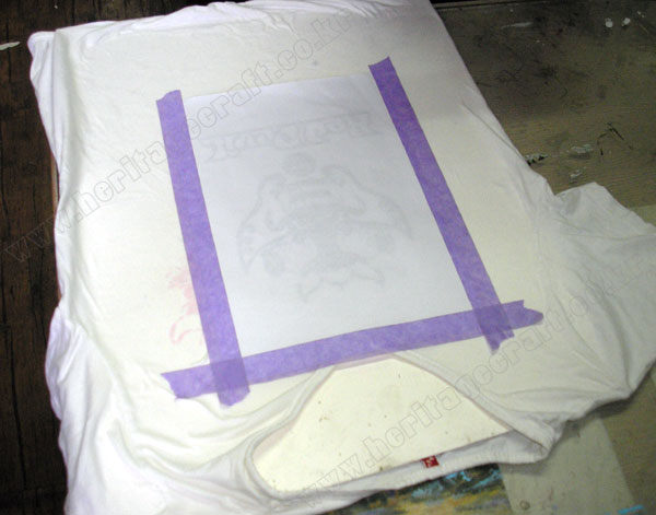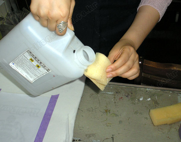 ▣스펀지(면걸레)에 적신 "락카신나"를 티셔츠에 고정한 그림의 뒷면에서 충분히 두두려 적신다.