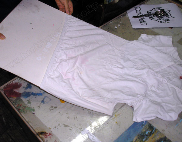 ▣티셔츠의 가운데를 별려 "하드보드지"를 넣고 당겨 평평하게 티셔츠를 고정한다.