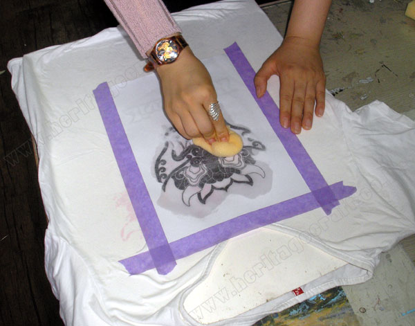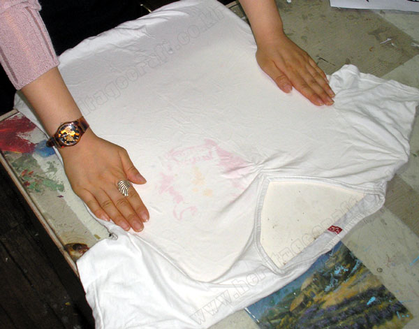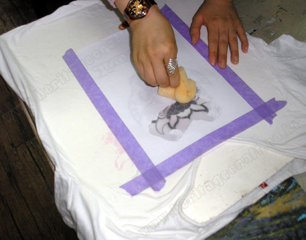 ▣스펀지(면걸레)에 적신 "락카신나"를 티셔츠에 고정한 그림의 뒷면에서 충분히 두두려 적신는 모습.