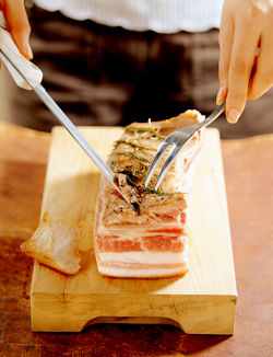 돼지고기는 각 부위별로 어울리는 조리법이 따로 있다던데… 부위별로 지방 함유량이나 근육 사용 정도가 다르기 때문에 육질이 다르지. 삼겹살은 지방과 살이 적절히 어우러진 부위지만 육질은 단단한 편이야. 굽거나 볶으면 지방이 부드러워져 씹는 맛이 좋단다. 목삼겹이라고도 불리는 목살은 삼겹살보다 지방 함유량이 좀 더 높고 씹는 맛은 부드러워. 돼지갈비는 단단한 근육 사이로 지방이 조금씩 들어 있어 조리했을 때 씹는 맛이 뛰어나. 주로 바비큐 양념에 재운단다. 안심은 가장 부드러운 부위로 스테이크나 동그랑땡을 해 먹으면 좋고, 등심 역시 부드러워 폭찹이나 햄버거 등을 해 먹기 좋아.