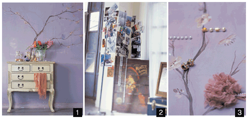 페인팅 기법으로 아트 월을 만드는데, 한 폭의 동양화를 보는 듯 꽃나무를 표현하고 사이사이 코사지, 귀고리, 목걸이, 반지의 꽃을 피운다. 벼룩 시장에서 건진 패션 소품과 액세서리는 정리함에 담아서 꼭꼭 숨겨 두기보다는 이처럼 인테리어 효과를 겸한 오픈 수납, 콜렉트 숍에서 봄직한 ‘fun’ 아이디어를 발휘한다.