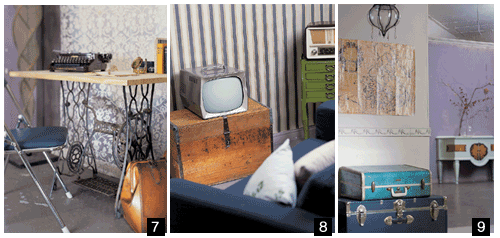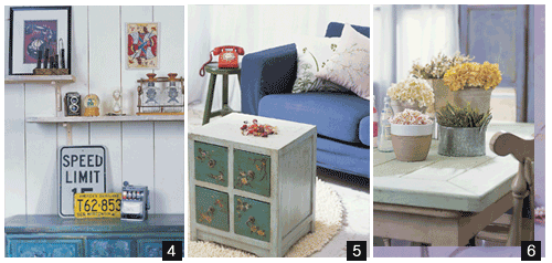 여유가 있을 때 하나씩 두개씩 사서 모은 카드 액자, 사진기, 자동차 번호판과 표지판 등 플리 마켓 소품들의 작은 전시장을 만들어 보자. 화이트 우드 패널벽은 미국식 컨트리 인테리어에서 배운다. 투박한 원목 선반은 스칸디나비아풍이다. 연로한 어르신 방에서나 볼 수 있을까, 한물간 유행의 자개 문갑에 청록색 유성 래커로 칠을 해서 함께 배치. 국적을 초월한 스타일의 믹스 & 매치에 주목한다.