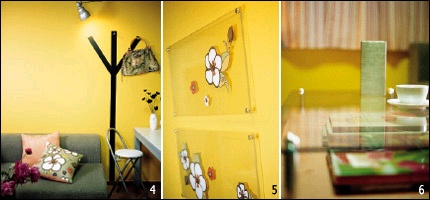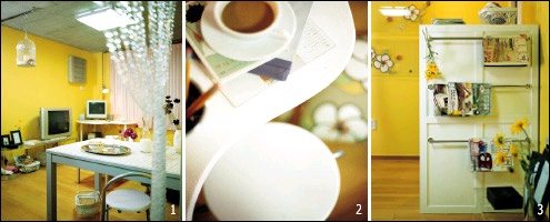 기존의 가구들을 심플하고 고급스럽게 리폼하고 로맨틱한 소품으로 장식했다. 벽면은 상큼한 옐로 컬러 페인트를 칠하고 핑크 컬러의 패브릭과 소품으로 포인트를 주었다. 화사한 옐로 컬러의 페인트는 벤자민 무어 제품. 스트라이프 패브릭을 천장에 설치한 철봉에 링을 끼운 후 핀을 꽂아 연결하면 쉽게 커튼을 만들 수 있다.