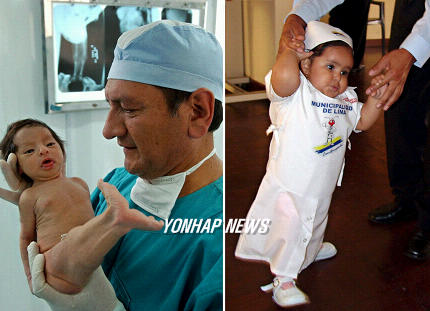 epa00826993 A combo of two pictures of the 'Mermaid baby' Peruvian Milagritos Cerron Arauco. At left a picture dated 05 May 2004 of Milagritos at the age of eight days as she is beeing held by a doctor in Lima. Picture at right dated on Monday 25 September 2006 shows Milagritos taking her first steps after the second surgical intervention in which her legs were completely separated, in Lima, Peru. The surgery was carried out by specialists from Lima Solidarity Hospitals. The so called Mermaid syndrome, with fused-together legs, is a rare birth defect. EPA/PAOLO AGUILAR