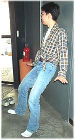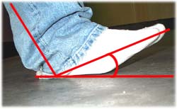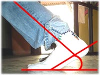 역시 오른쪽 사진처럼 발의 각도가 중요하다 하겠다. 일케 자세 잡고 있음 발꼬락 및 발꿈치가 졸라 저려온다. 하지만, 발 뒤꿈치를 확실히 들어야 연습이 된다는 것을 절대 명심하시라. 요 자세는 슬로프상에서 프론트 사이드 엣지를 주었을 때를 지상에서 고대로 재현한 연습 되겠다.