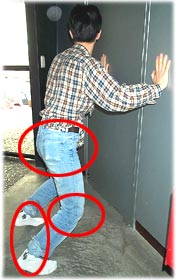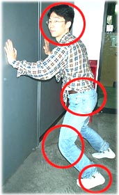 이렇게 허리를 편 상태로 기대게 되면, 허리와 벽과의 사이에 공간이 생긴다. 이 공간을 유지하고, 왼쪽 사진에서처럼 발의 앞쪽은 들어주어야 한다.