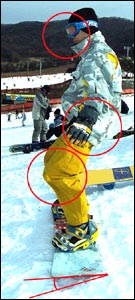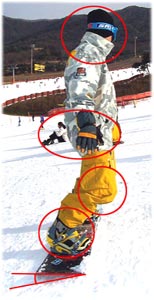 이것은 슬로프에서 백사이드 엣지를 주었을 때의 상황을 지상에서 재현한 연습이 되겠다. 이때에 주의할 점은 사진 3에서 보는 바와 같이 허리를 편 상태로 기대는 것이다.