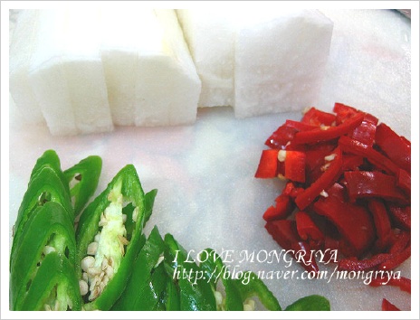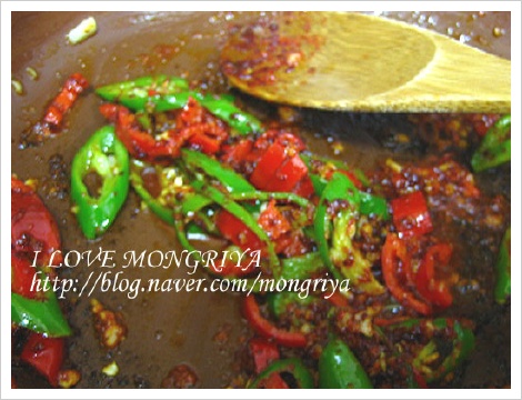 5.냄비에 식용유를 둘러 달군 후 붉은고추.풋고추 ,다진마늘,고추가루를 넣고 달달볶아주세요. 6. 여기에 다시 무를 넣고 볶아주세요.