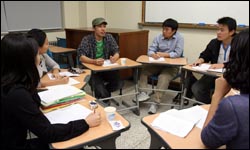 17일 오후7시 서울 정릉의 국민대 공대 101호 강의실. 이 학교 학생 3명과 다른 학교 학생 4명으로 구성된 취업스터디 모임이 모의 집단토론을 하고 있었다. 북한 핵실험을 주제로 진지한 토론을 마치고 서로를 평가하는 시간이 이어졌다. “너는 의견을 말할 때 자신감이 없어 보여”, “선배는 남이 말할 때 중간에 끼어 드는 습관을 고쳐야 할 것 같아요”. 한 학생은 “다음 모임 땐 실제 면접장에서 써먹을 수 있는 장기를 하나씩 준비해 오기로 했다”고 말했다.