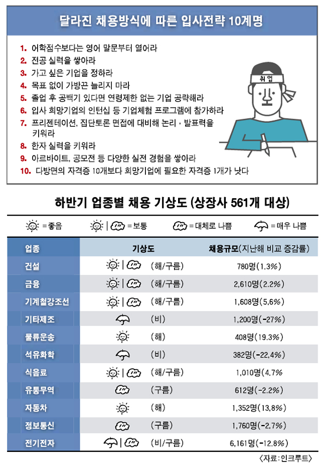 수백대 1의 관문을 뚫어야 하는 취업준비생들은 분주하다. 인터넷 각종 취업카페 게시판에는 스터디모임 회원을 구하는 글이 하루에도 수십 건이다. 취업박람회 등에는 정보를 얻으려는 사람들로 발 디딜 틈도 없다. 취업포털 인크루트 이광석 대표는 “기업들의 채용방식이 천차만별인 만큼 가고 싶은 기업 몇 곳을 골라 집중적으로 준비하는 게 현명하다”고 말했다.