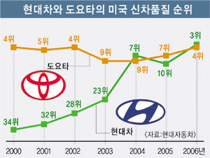 ◇세계 일류를 꿈꾸는 현대차=‘2000년 34위에서 2006년 3위’. 6년 만에 미국 내 신차 품질 순위가 31계단이나 뛴 현대차의 질적 도약은 한국자동차 성장의 키워드다. 이뿐이 아니다. 그랜저는 미국 소비자 만족도 1위를,투싼은 소비자조사기관인 JD파워로부터 스포츠유틸리티차량(SUV) 부문에서 품질 세계 1위라는 평가를 받았다. 환율 하락과 고유가에 대한 우려는 엄살인가 싶을 정도로 올해 세계 최대 자동차 시장인 미국에서 보여주는 현대차의 성적표는 경이 그 자체다.