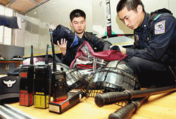 ◆ 폭력시위대가 가장 두려워=몸이 고생하는 것보다 더 견디기 힘든 건 과격.폭력 시위대와 맞서야 한다는 두려움이다. 박 수경은 "돌이나 쇠파이프 같은 불법시위용품으로 무장한 시위대를 보면 무서워서 가슴이 떨린다"며 "포항 형산로터리에서 노조원 5000명과 맞붙었을 땐 시위대가 삽으로 옆에 있던 의경의 손을 찍어 손가락이 잘리는 걸 봤다"고 말했다. 신참 의경들은 그런 시위에 한번 갔다오면 부상이 없어도 앓아 누울 정도로 마음 고생이 심하다.