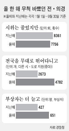 그의 말대로 4만여 전.의경 대원들은 올 한 해 무척 바빴다. 다른 시.도로 지원을 나간 중대의 수는 올 9월 30일 현재 4700여 개에 달한다. 예년 평균은 2000~3000여 중대 정도다. 그만큼 전국을 무대로 뛰어다녔다는 것이다.