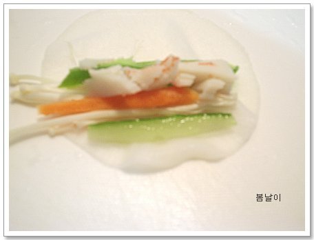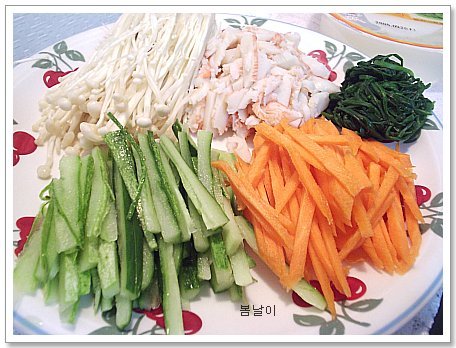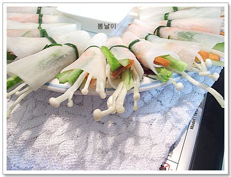 팽이버섯,크래미맛살,오이,당근,피망살짝데친부추를 준비합니다..그외에 햄이나,무순,달걀지단등 여러가지로 응용해보세요..