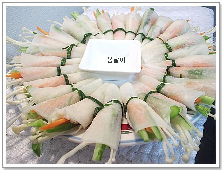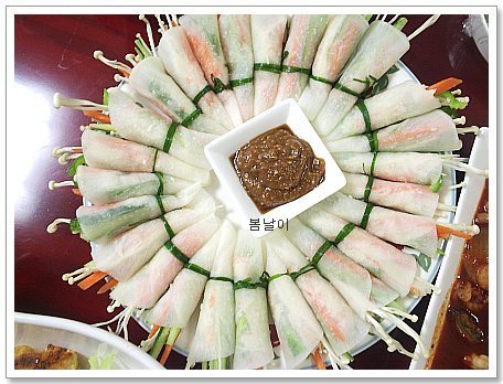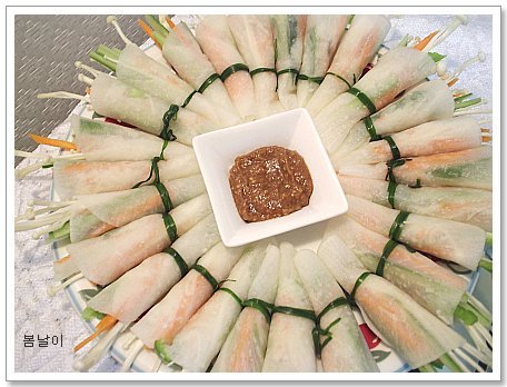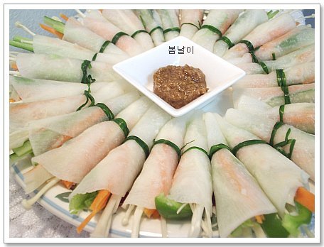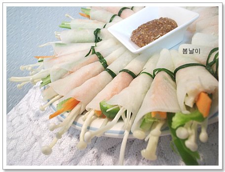 무쌈말이~사실 인기가 제일 좋았어요..특히 소스맛이 너무고소해서~칭찬을많이받은 음식이랍니다..집들이나 생신상에는 느끼한 음식들이많은데~그럴때 한개씩 먹으면 너무 상큼해요~소스의 비율을 알려드릴께요~저도 배운건데..무쌈말이랑 아주 잘어울리네요..소스는 땅콩버터1,깨소금1,식초1,레몬즙1,꿀1,설탕1,간장1,연겨자,소금,후추조금씩~진짜 고소한 소스예요..맛있게 만들어 드세요..★봄날이~★