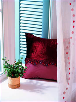 포인트 소품으로 좋은 강렬한 와인 컬러의 쿠션. 벨벳과 노방이라는 소재가 고급스러움을 더한다. 가장자리가 아닌 쿠션의 중앙에 장식용 술을 매치한 감각도 돋보인다.