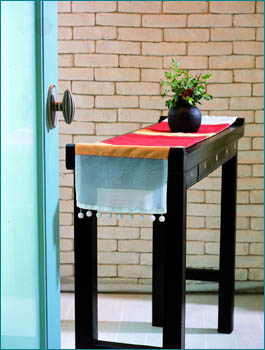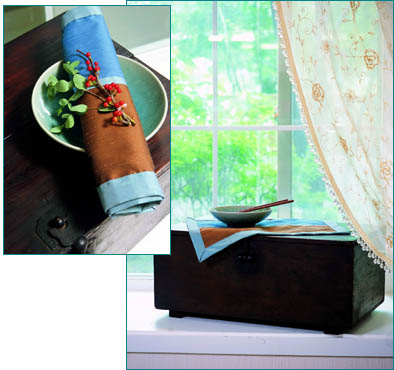 가장자리에 바이어스로 포인트를 준 테이블 매트. 실크와 톤 다운된 컬러가 은은한 멋을 더한다. 식탁 위에 올리면 1인용 매트로, 콘솔이나 테이블에 올리면 장식용 커버로 쓰임새도 다양하다.