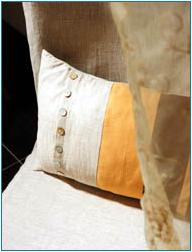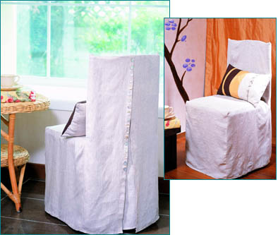자연스러운 주름이 멋스러운 린넨으로 만든 1인용 의자커버와 쿠션 세트. 여기에 자개단추를 나란히 달고 쿠션에 차분한 가을 컬러를 매치해 포인트를 주었다.