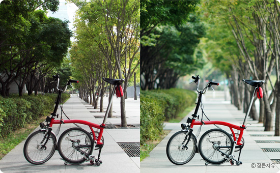 건전지 보다 조금 더 큰 내 자전거를 길위에 놓고 찍은 사진이다. 왼쪽은 똑딱이로 오른쪽은 DSLR로 찍은 것이다. 최대한 같은 구도를 유지하기 위해 애섰다. 두 사진 모두 조리개 값은 3.5 이다.
