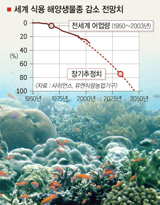 스티브 패럼비 미 스탠퍼드대학 교수와 캐나다 댈하우지대학의 보리스 웜 박사 등으로 구성된 연구팀은 12개 해안지역의 생태계 변동을 연구한 결과 지난 50년 동안 생선과 조개류, 해양식물 등 29%의 식용 생물이 이미 준멸종(collapse) 상태에 이른 것을 확인했다고 영국 BBC 등 외신들이 3일 전했다. 연구팀에 따르면 홍합과 대합, 참치, 황새치 등과 생선은 이미 멸종 단계에 진입한 것으로 나타나 충격을 안겨주고 있다.