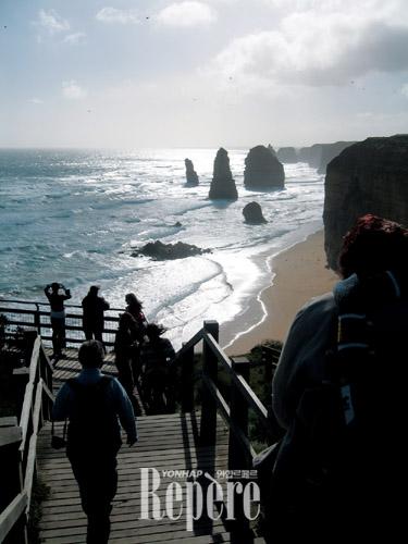 바위섬 무리인 12사도상은 이제 막 성지에 도달한 순례자들처럼 장엄하면서도 고단해 보였다. 50~70m 높이의 암봉이 해안선을 따라 길게 늘어서 있었다. 처음 이름이 붙여졌을 당시엔 12개가 서 있었지만 현재는 8개만 남았다. 거친 파도와 강한 해풍에 쉼 없이 침식당해 언젠가는 모두 바다 속으로 사라질 운명이었다.