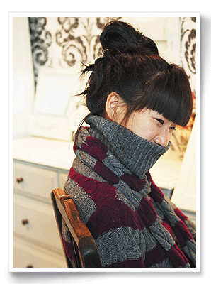 ▶2/3 돌려 묶기심하게 옆으로 돌려 묶으면 촌스러운 안티 패션이 되기 쉽다. 머리 중 2/3 지점까지만 살짝 돌려서 가운데 묶은 것처럼 돌려 묶는 게 정석이다. 골지 풀오버 가격미정 베네통, 스트라이프 니트 머플러 4만8천원 온앤온, 스트라이프 니트 베레모 3만9천원 ENC.