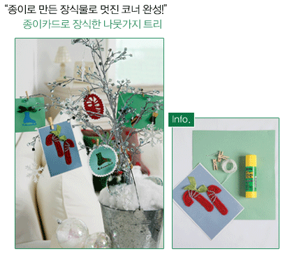 ◆ 종이카드로 장식한 나뭇가지 트리장식용 나뭇가지에 알록달록한 카드를 달아 작은 트리를 꾸며보자. 나뭇가지에 호일을 감거나 은색 스프레이를 뿌리면 화려한 느낌을 더할 수 있다. 양철통이나 화병에 솜을 넣고 가지를 꽂은 다음 갖가지 모양의 카드를 달면 완성.