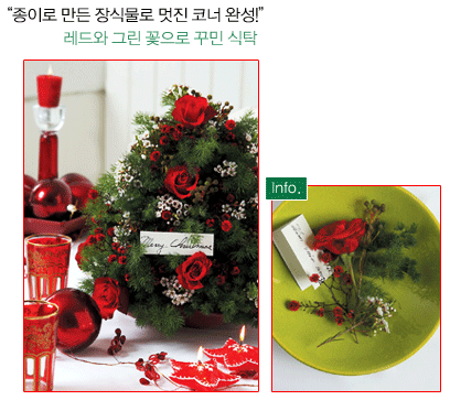 ◆ 레드와 그린 꽃으로 꾸민 식탁크리스마스 장식을 미처 준비하지 못했다면 성탄 전야의 저녁 식탁에 멋진 꽃장식을 놓아보자. 그린과 레드 컬러의 꽃을 섞어서 테이블을 세팅하면 크리스마스 분위기를 내기에 충분하다.