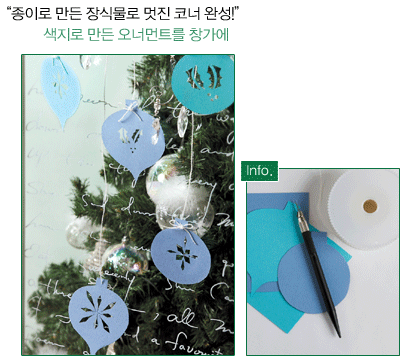 ◆ 색지로 만든 오너먼트를 창가에색지를 여러 번 접어서 오리거나, 칼로 정교한 모양을 내면 화려한 장식품으로 활용하기 좋다. 갖가지 모양으로 오린 종이 오너먼트를 창가에 매달아 파티 분위기를 연출해보자.