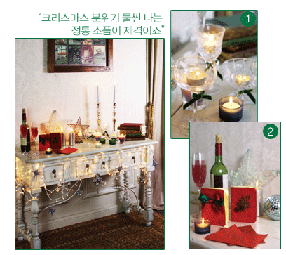 info. 1_ 이 빠진 와인잔에 벨벳 리본테이프로 만든 리본 장식을 달고 미니 초를 넣어 장식 촛대로 꾸민다. 2_ 콘솔이나 서랍장 위에 꼬마전구를 늘어뜨리고 장식 촛대와 크리스마스 카드를 적절히 배치한다.