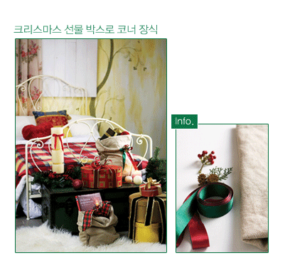 ◆ 크리스마스 선물 박스로 코너 장식아이 방 침대 발치의 베드벤치나 스툴에 선물 상자를 쌓아 멋진 코너를 꾸며보자. 크리스마스 아침에 일어나서 깜짝 놀라는 아이의 모습을 상상하는 것만으로도 행복해진다. 다양한 색깔의 상자로 장식하는 것도 좋고, 마 소재 천을 박음질해서 선물주머니를 만들어도 이색적인 느낌을 준다.