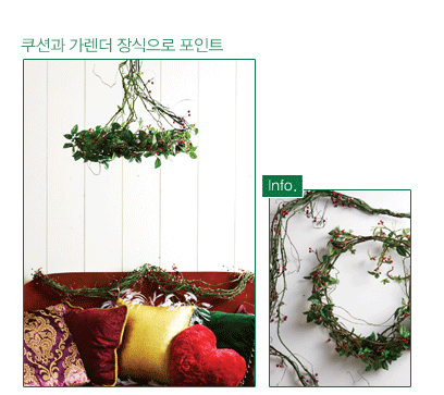 ◆ 쿠션과 가렌더 장식으로 포인트거실 소파에 놓는 쿠션 몇 개만 바꿔도 실내 분위기가 달라지게 마련. 그린과 레드, 골드와 바이올렛 컬러가 믹스된 쿠션들로 포인트를 주자. 벨벳 소재의 쿠션을 매치해도 고급스럽다. 또 값비싼 샹들리에를 대신해 소파 벽면에 망게 열매로 장식된 리스와 가렌더로 만든 등 장식을 다는 것도 화려함을 더하는 아이디어.