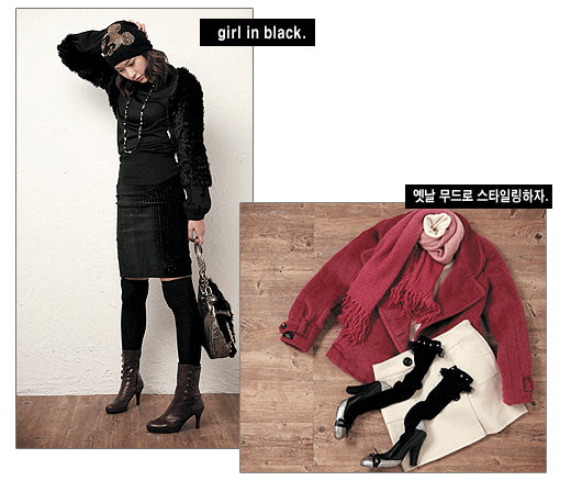 girl in black. 진하지만 깔끔한 맛이 있는 블랙 커피처럼 올 블랙 룩은 깊고 고급스런 느낌을 은은하게 풍기니까. 퍼 재킷 21만8천원·터틀넥 니트 5만8천원 잇미샤, 스커트 8만9천원 쿠아, 모자 3만5천원 ·골지 스타킹 8천9백원 ASK, 부츠 20만원대 SSAM, 목걸이 11만8천원 셀바폰테.옛날 무드로 스타일링하자. 블랙 타이즈를 모직 미니스커트에 에나멜 부츠와 매치하면 80년대 영화 속 여주인공처럼 모던 빈티지 스타일이 완성. 니삭스 스타일의 블랙 스타킹 1만8천원 GGPX, 터틀넥 니트 3만원대 클라이드, 코듀로이 재킷 14만9천원 르샵, 스커트 7만9천원 쿠아, 슈즈 13만8천원 MNG.