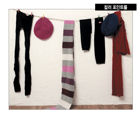 컬러 포인트를 줘서 힙하게. 블랙 스타킹과 어울리는 의상을 선택하다 보면 전체적으로 칙칙한 스타일이 될 수 있으니 모자, 롱 머플러 등 소품에 컬러감을 줄 것. 왼쪽부터 스타킹 1만9천원 잭앤질, 모자 3만9천원 MLB, 머플러 4만원대 1492 마일즈, 블랙 워머 1만9천원 ASK, 레드 컬러 머플러 4만8천원 리스트.