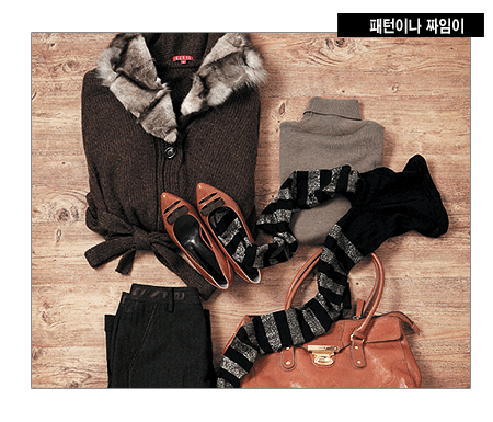 패턴이나 짜임이 있는 블랙 스타킹은 프린트가 배제된 모노 톤 의상과 매치하자. 디테일 역시 심플하고 모던한 의상으로. 스트라이프 패턴의 스타킹 2만8천원 리스트, 터틀넥 티셔츠 11만8천원·백 19만8천원·펌프스 17만8천원 올리브데올리브, 점퍼 39만9천원 엘르스포츠, 코듀로이 팬츠 8만8천원 리스트.