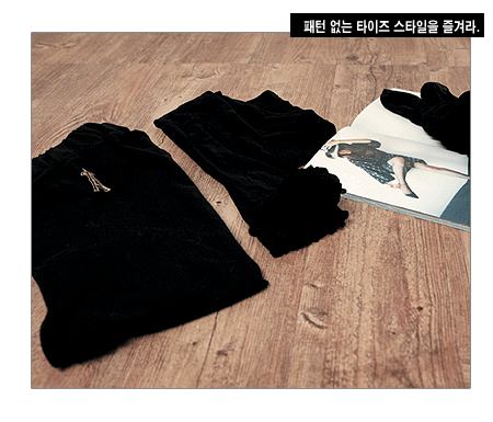 패턴 없는 타이즈 스타일을 즐겨라. 얇은 스타킹은 안쪽의 살색이 비쳐서 트렌디하지 못한 느낌이 드니까. 왼쪽부터 심플한 블랙 레깅스 2만9천원 ASK, 끝단에 고무단 장식이 있는 레깅스 가격미정 DOHC, 블랙 스타킹 가격미정 MLB.
