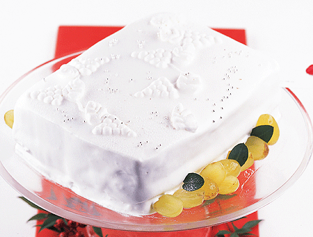 4_③의 표면에 생크림을 올려 고루 바른 뒤 짤주머니를 이용해 포도 모양으로 데커레이션하고 실버 구슬과 청포도로 마무리한다.