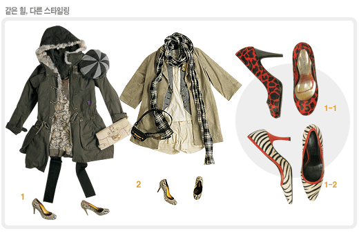 1-2 레드 컬러와 날렵한 구두 라인의 조화가 아찔하다. 말초적인 관능미를 내고 싶다면. 15만8천원 list.