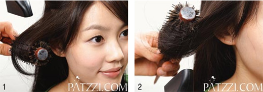 옆머리 안으로 말기옆머리를 적당한 양으로 나눠 잡은 후 굵은 롤 브러시를 뿌리 부분에 대고 얼굴 쪽으로 머리를 끌어당기듯이 빗어가며 드라이한다. 이렇게 머릿결 방향을 정갈하게 한 후 머리 끝부분을 롤에 감아 드라이 열을 쐬어준다.